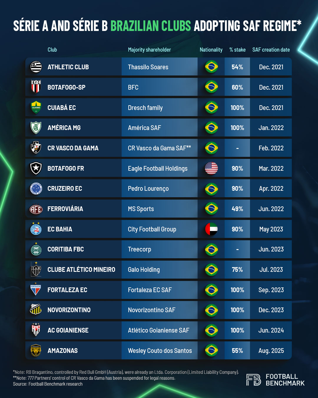 Within this group, four have attracted foreign investors: Botafogo FR (John Textor via Eagle Football Group), CR Vasco da Gama (777 Partners, which ultimately lost control of the club due to legal issues), EC Bahia (City Football Group) and Coritiba FBC (Grupo Independiente Del Valle, as a minority shareholder). RB Bragantino, controlled by Austria’s Red Bull GmbH, were already operating as a limited company under the previous corporate structure.