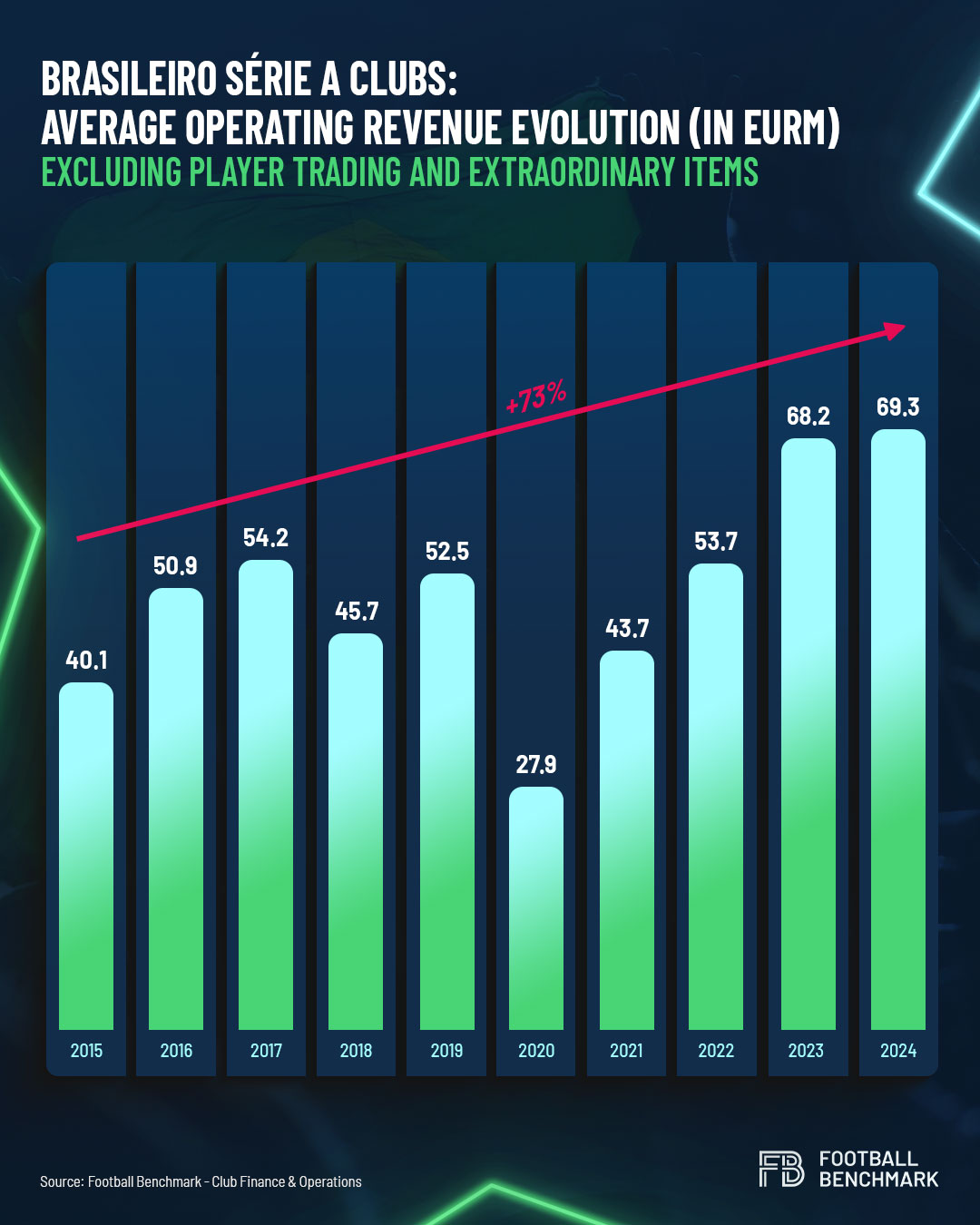 Average operating revenues, excluding player trading and extraordinary income, of Série A clubs increased by 73% between 2015 and 2024, reaching a record €69.3m. Growth has been driven primarily by matchday income supported by 2014 World Cup stadium infrastructure, rising commercial revenues and prize money from international competitions.