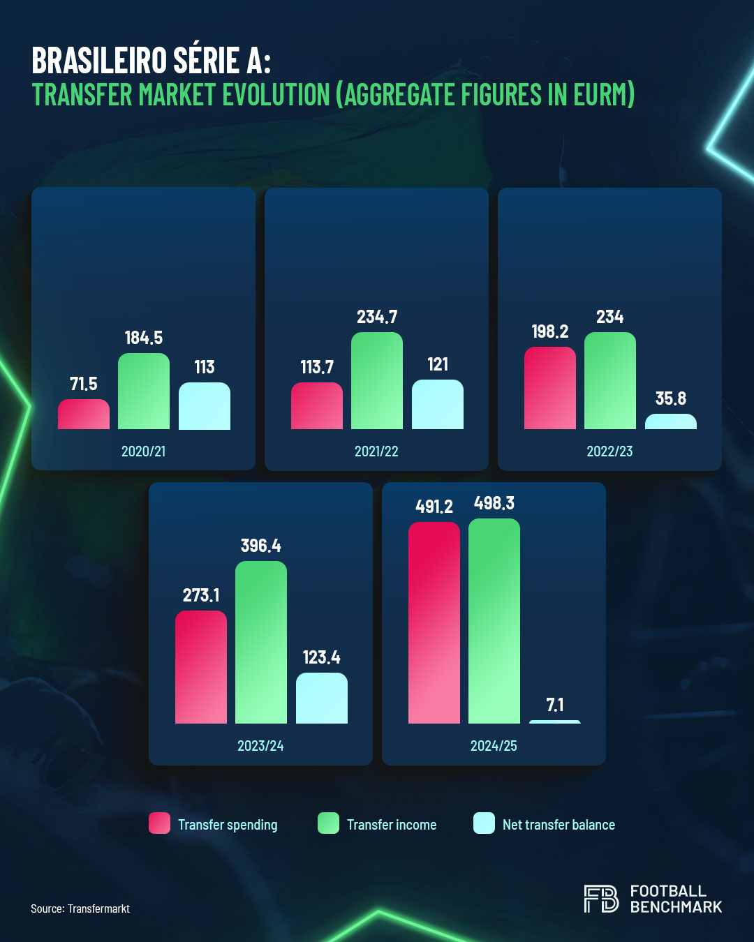 In addition, the league generated a positive cumulative five-season net transfer balance of approximately €400m, the sixth highest worldwide. At club level, Botafogo FR, SE Palmeiras and CR Flamengo were the top spenders over the past five seasons, while the trio of top earners included SE Palmeiras, SC Corinthians and Club Athletico Paranaense, with these three also recording the strongest cumulative net balances.
