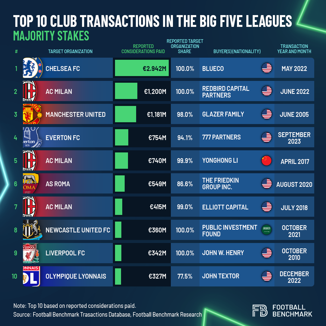 Unsurprisingly, half of the clubs featured on the list of the top 10 transactions involving majority stakes belong to the English Premier League, signifying the evident allure of the highest tier of English football. The Italian Serie A stands out as the second most represented league on the list, however, AC Milan accounts for three out of the four transactions.