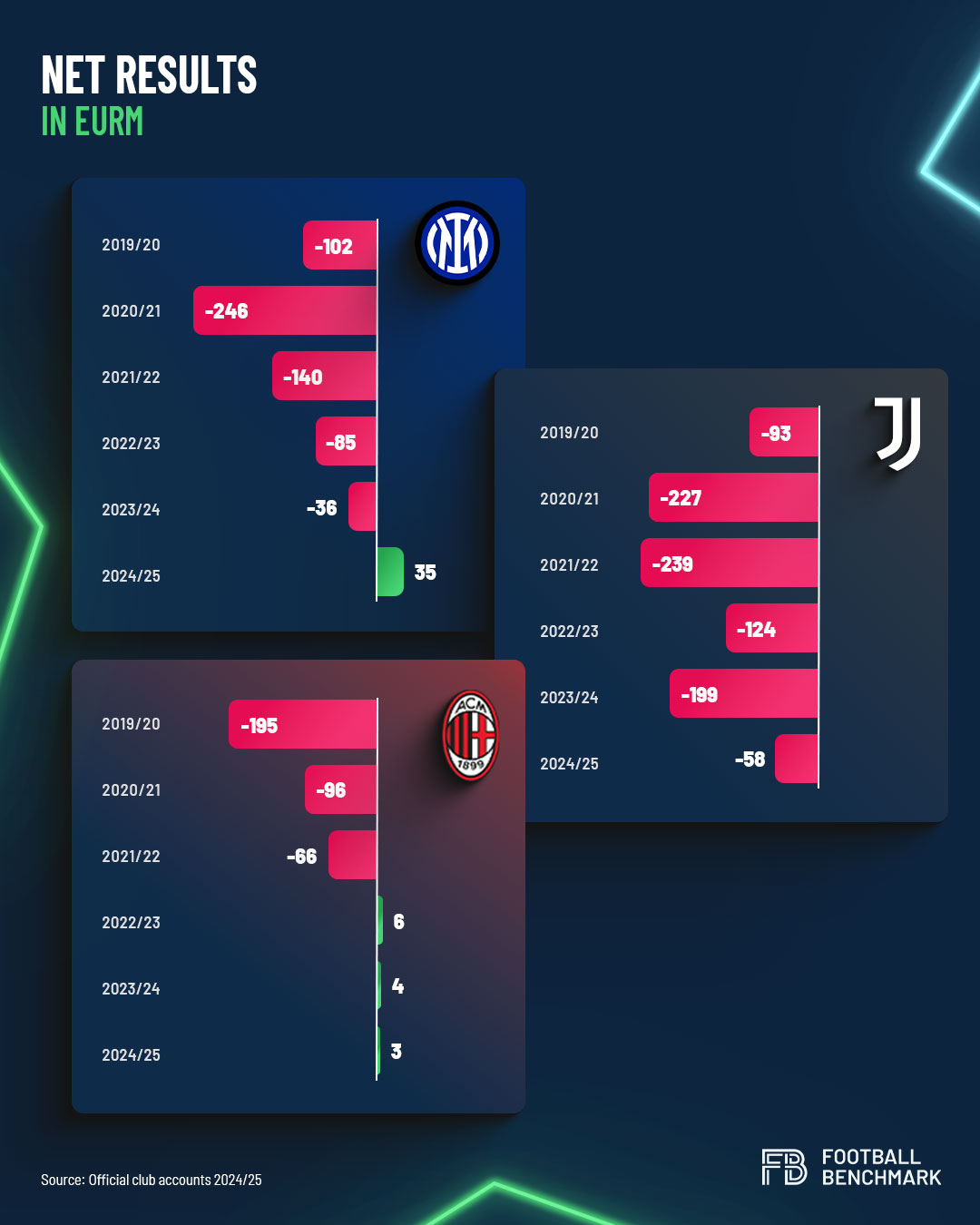 The bottom line of the income statement reveals significant differences. The two Milan clubs celebrate profits. For Inter, the €35 million profit is a one-off: at least since the days of Ernesto Pellegrini, the Nerazzurri had known only losses. Last season marked a turning point after a gradual reduction of the deficit: from –€246 million in 2020/21 to –€140 million in 2021/22, –€85 million in 2022/23 and –€36 million in 2023/24.