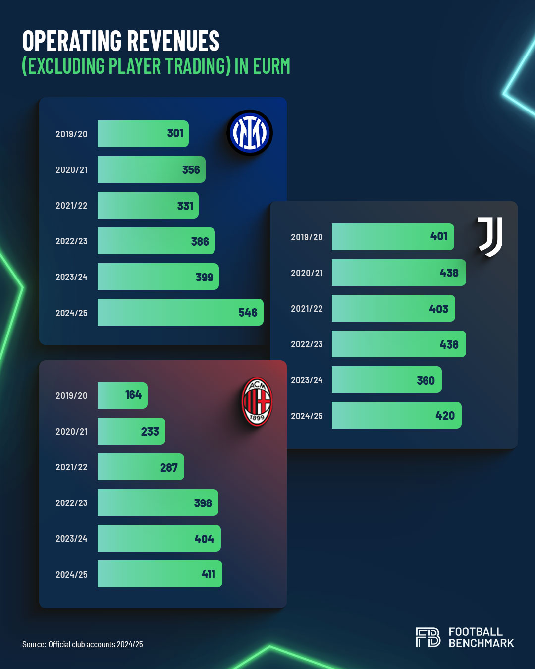 The macro picture of core revenues – i.e., excluding transfer activity – is as follows: Inter €546 million, Juventus €420 million, AC Milan €411 million. It is worth noting that Juventus, with a 41,000-seat stadium, generate €72 million in matchday income, plus €8 million from hospitality and €10 million from naming rights, which appear under commercial revenues. Inter, by reaching the latter stages of the Champions League, earned €103 million from their 75,000-seat venue, while AC Milan reached €68 million.