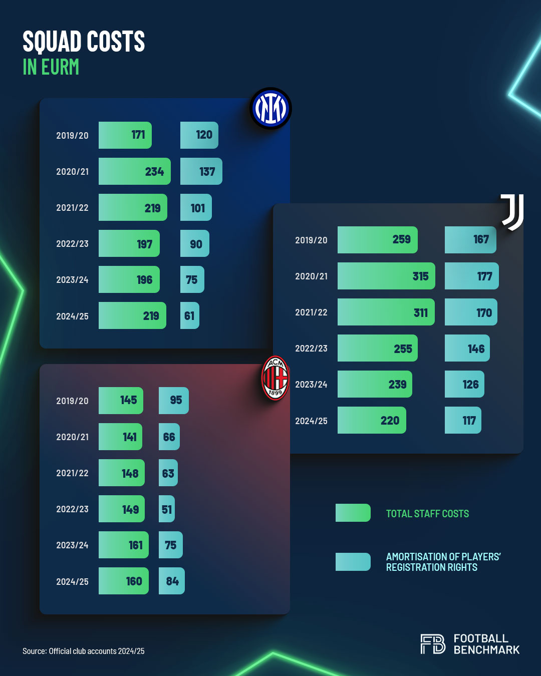 Juventus and Inter, despite cost-containment efforts, continue to present higher wage bills: €220 million and €219 million, respectively. AC Milan, under RedBird, returned to spending significant amounts on transfers, while maintaining sustainable salary levels. Thus, amortisations jumped from €51 million in 2022/23 to €84 million in the latest financial year, overtaking Inter (€61 million) but still far below Juventus, which a few years ago reached €170 million before falling to €117 million.