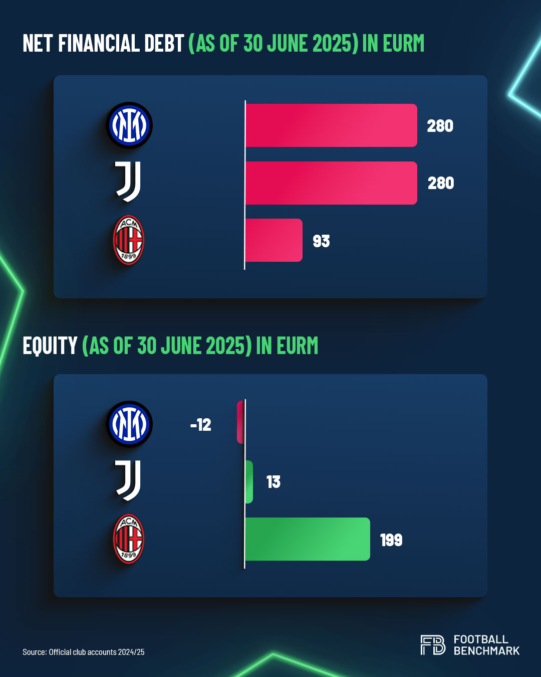 Moving on to equity structure: as of 30 June 2025, AC Milan boasted €199 million in equity, the result of accumulated profits in recent years but above all Elliott’s capital injections (€565 million in total), which were necessary to restructure the club. Juventus shareholders have been even more generous, as the economic and financial situation required it: between 2019 and 2024, three capital increases were carried out totalling €900 million. Nevertheless, due to massive losses, Juventus’ equity fell to €13 million as of 30 June 2025. Exor has already advanced €30 million ahead of yet another recapitalisation – up to €110 million – to be executed in early 2026.