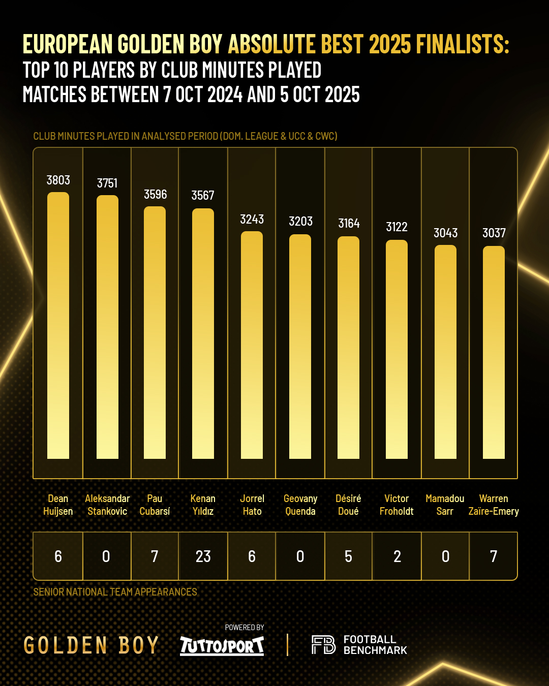 The Golden Boy Football Benchmark Index, developed by Football Benchmark in collaboration with Tuttosport, provides a data-driven assessment of Europe’s top young players. It assesses on-pitch performance, playing time, and club strength, forming the basis for the European Golden Boy Absolute Best award, with the final selection made by a jury of 50 journalists from across Europe. The 2025 ranking covers players born after 1 January 2005, assessed on performances between 7 October 2024 and 5 October 2025.