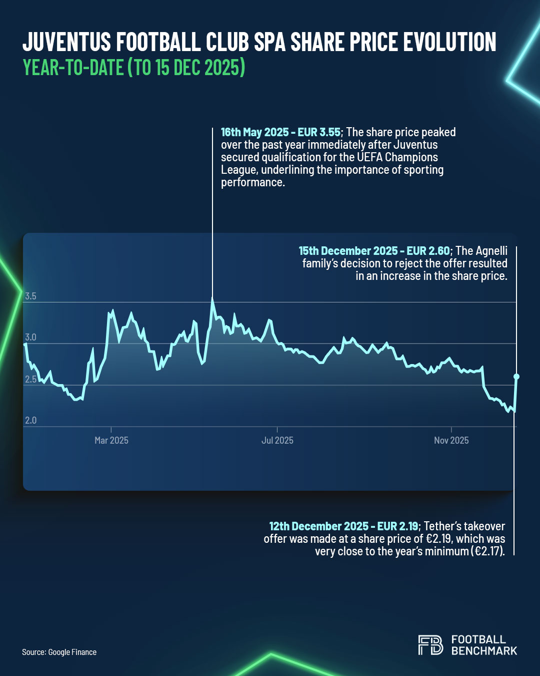 Juventus’ share price evolution over 2025 is central to understanding how Tether arrived at its implied valuation. Over the past 12 months, the share price peaked at €3.55 on 16 May, following qualification for the UEFA Champions League, before declining steadily over the subsequent months. On 9 December, the share price hit a year-low of €2.17, closely aligning with Tether’s strategic offer made after market closure on Friday, 12 December.
