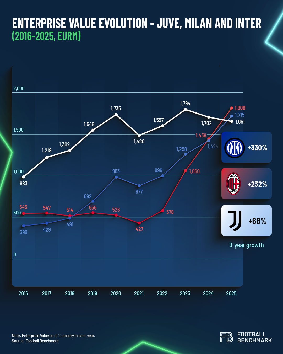 Since 2016, Juventus’ EV has increased by approximately 68%, reflecting long-term growth alongside periods of volatility. Over the same timeframe, the two other Serie A giants have experienced significantly stronger relative growth. AC Milan’s EV rose from €545m in 2016 to €1.81bn in 2025 (+232%), while Inter’s more than quadrupled, from €399m to €1.72bn.