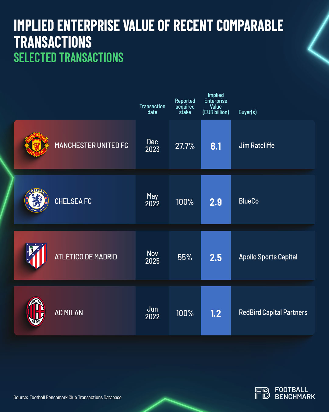 Recent transactions involving elite European clubs help frame expectations around valuation and ownership change. Manchester United’s implied Enterprise Value of €6.1bn, Chelsea’s €2.9bn, Atlético de Madrid’s €2.5bn, and AC Milan’s €1.2bn illustrate the range at which “trophy assets” have changed hands in recent years.