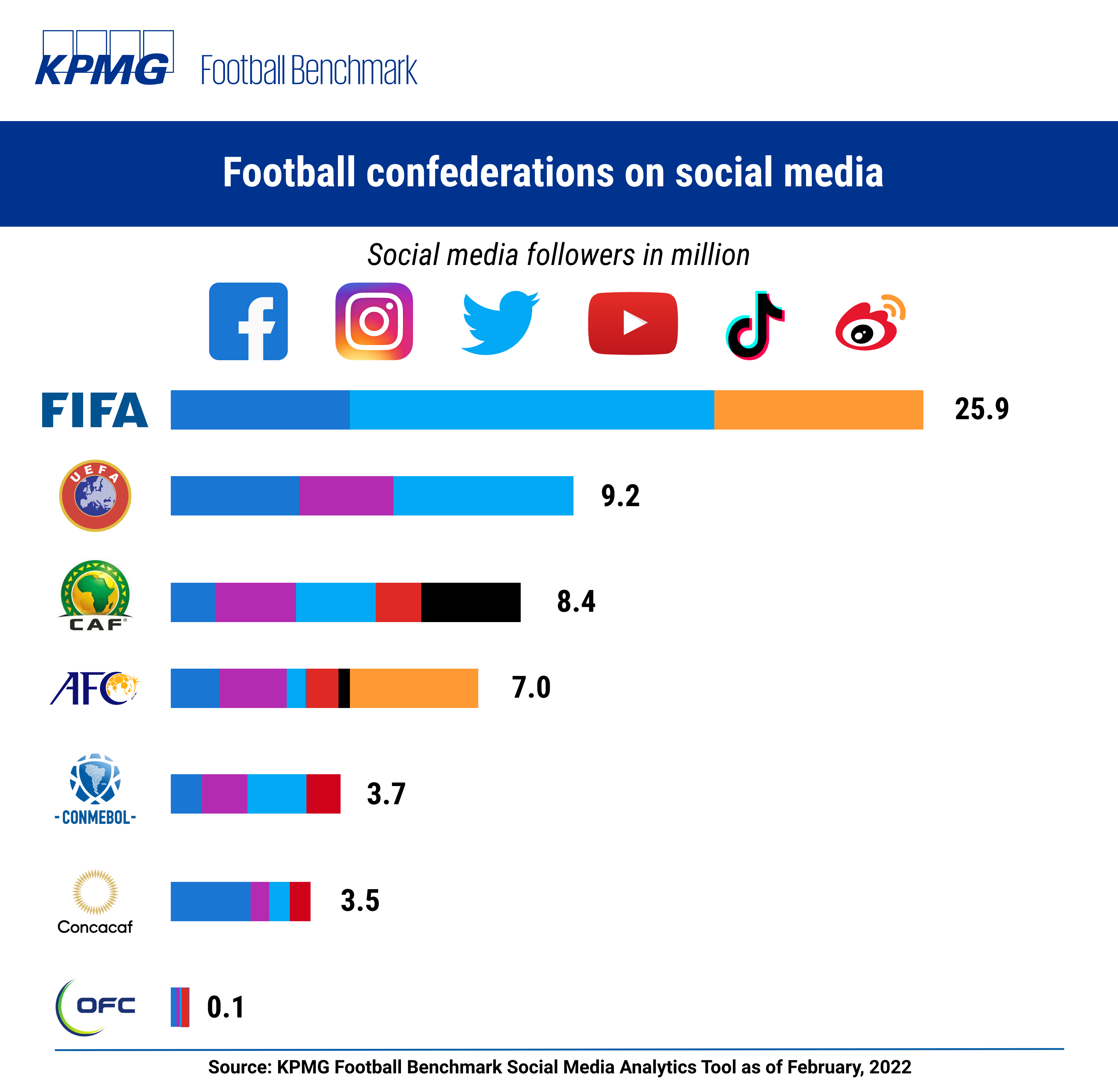 According to the organizers, the TotalEnergies AFCON 2021 was broadcast live in 157 countries by major broadcasters, such as beIN Sport across North Africa, the Middle East, in the Asia-Pacific region and North America, including the United States, and ESPN in its Latin American territories, while coverage in the UK was provided by the BBC and BSkyB. For areas not covered, CAF streamed all matches live on its YouTube channel. In terms of social media, AFCON’s official page was represented only on Facebook, but claims 5.3 million followers, which makes AFCON 21 the 10th most popular football competition on Facebook. The tournament, however, was heavily promoted on CAF’s social channels – in fact, according to our Social Media Analytics Tool, CAF is the third most popular football confederation on social media, behind only FIFA and UEFA, with 8.4 million followers combined on its channels (Facebook: 633k; Instagram: 2.3 million; Twitter: 2.2 million; Youtube: 991k; Tiktok:2.3m).