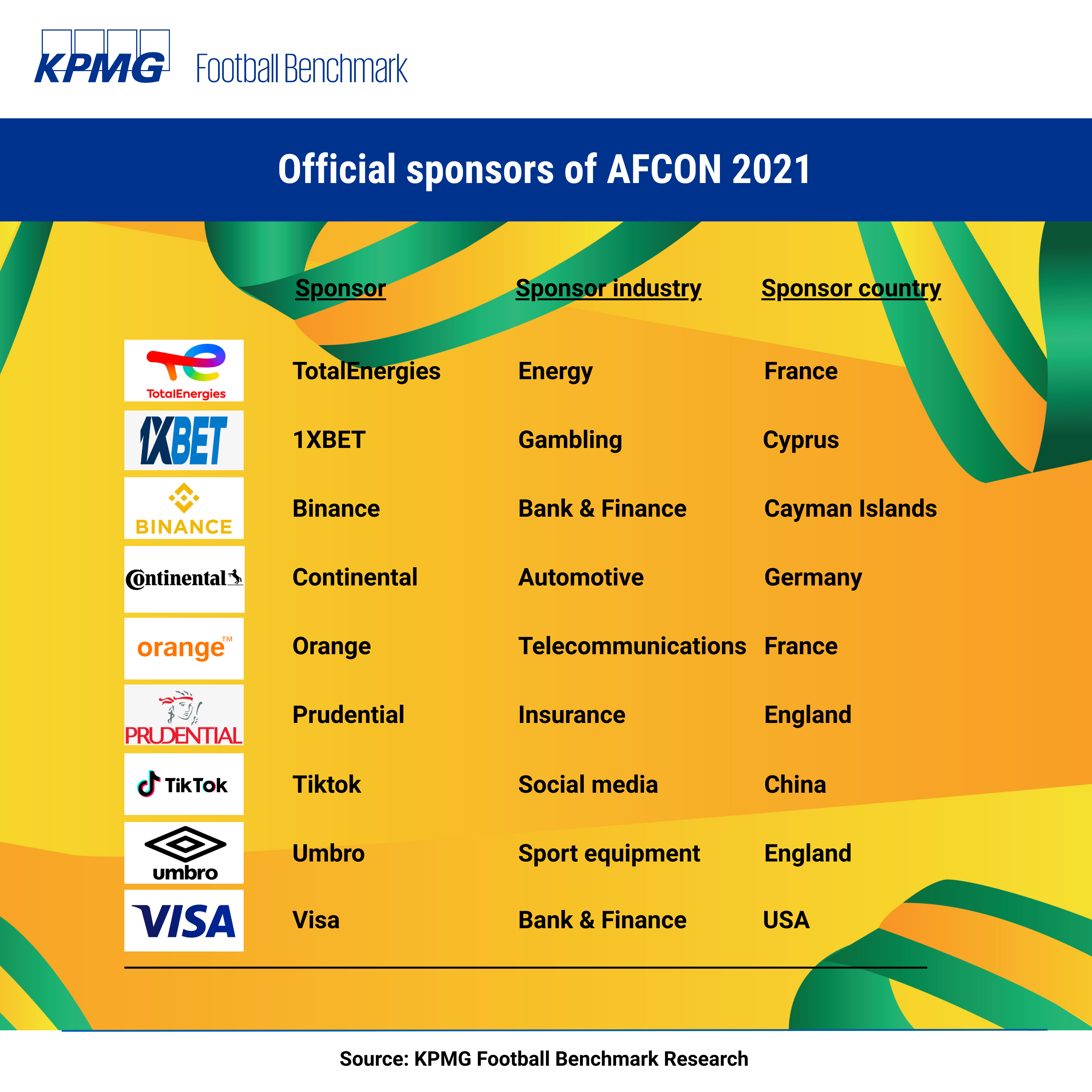 AFCON 21 had one title sponsor, along with eight official and three national sponsors. Some of them were announced, rather unusually, only shortly before the start of the tournament, with cryptocurrency exchange platform, Binance being revealed only several days before kick-off. The brand featured for the tournament’s “assist awards” (of the day, week and tournament). Similarly to Binance, Tiktok, Umbro and 1XBET became last-minute sponsors. Umbro kitted all referees, volunteers, and associated personnel as well as providing the official match ball ‘Toghu’, which was named after traditional Cameroonian outfits. French energy company Total Energies was the title sponsor of the tournament: Total entered into an eight-year partnership with the Confederation of African Football (CAF) in 2016, becoming the title sponsor of 10 CAF-organized tournaments: the deal is reportedly worth a total of USD 250 million.