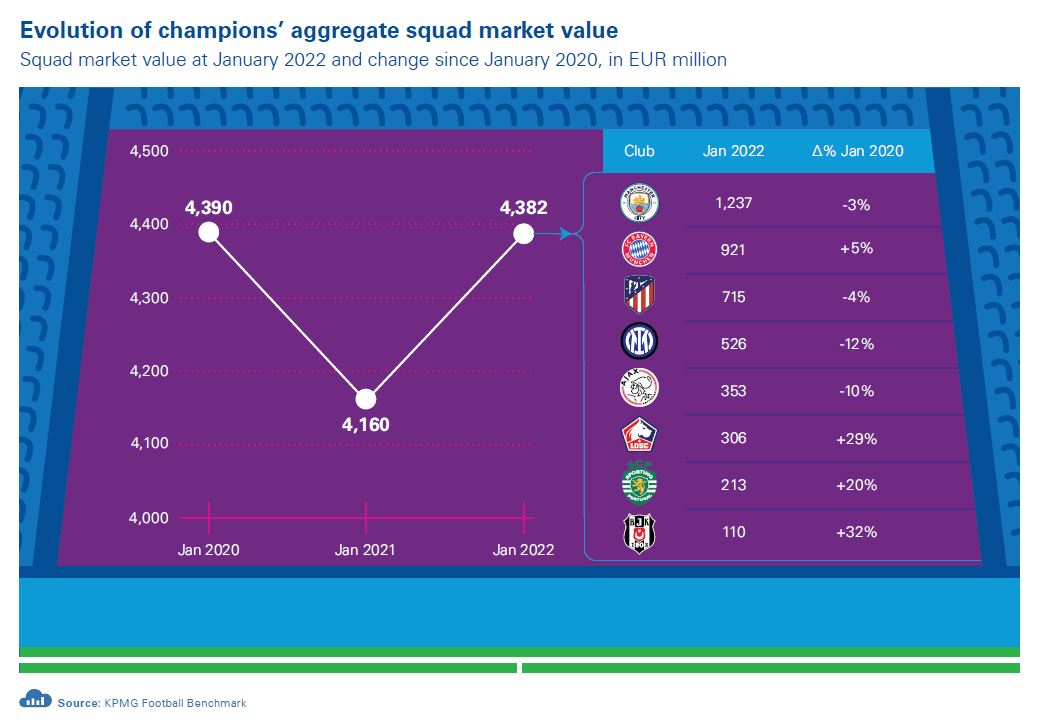 Players’ market values and clubs’ squad values have also been strongly impacted by COVID-19. Indeed, four champions saw a decrease in their squad value over the past two years: FC Internazionale’s 12% drop was primarily due to the departure of important players during the latest summer window. Conversely, Beşiktaş JK, LOSC Lille, Sporting CP and FC Bayern München have all managed to increase their squad market value since January 2020. Currently, Manchester City FC boast the highest squad market value (EUR 1,237m) globally, and are also one of the only three clubs overcoming the EUR 1 billion threshold, along with Chelsea FC and Manchester United FC.