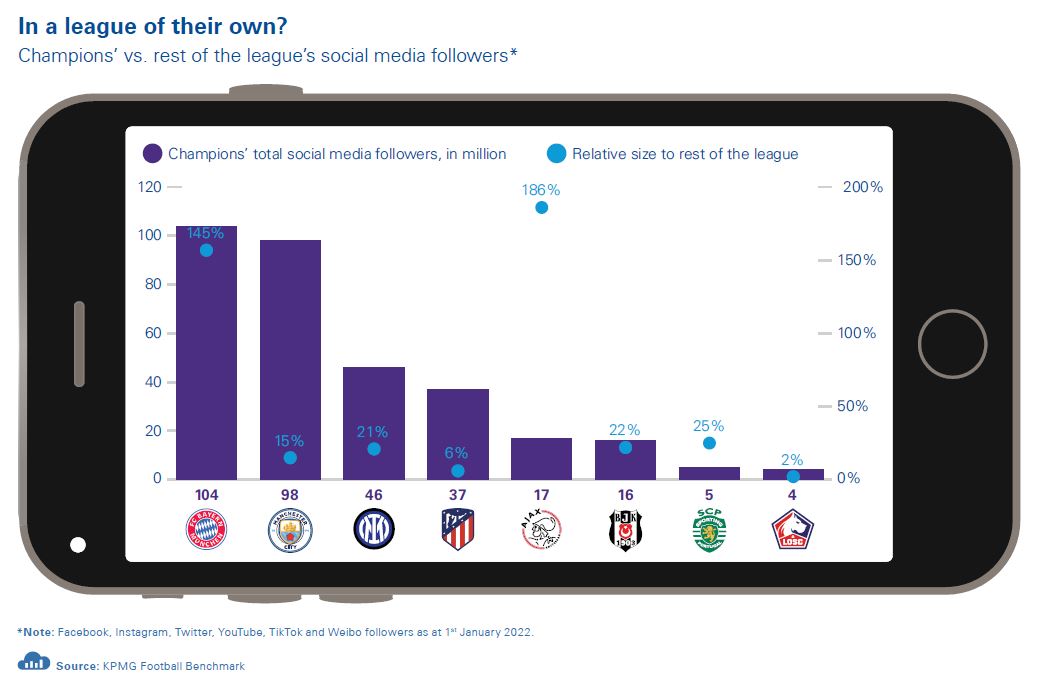 Looking at the social popularity of these champions5, we can see that AFC Ajax and FC Bayern München have more followers than the other clubs competing in their league combined. In absolute values, the Bavarians are the most followed club in the sample (104m total followers), closely trailed by Manchester City FC (98m), while they are 8th and 9th in the overall ranking, which is dominated by Spanish giants FC Barcelona (282m) and Real Madrid CF (279m). The lowest ratio in our analysis is recorded by LOSC Lille, whose 4m followers make up only 2% of all the other Ligue 1 clubs, dominated by the 143m followers of Paris Saint-Germain FC.