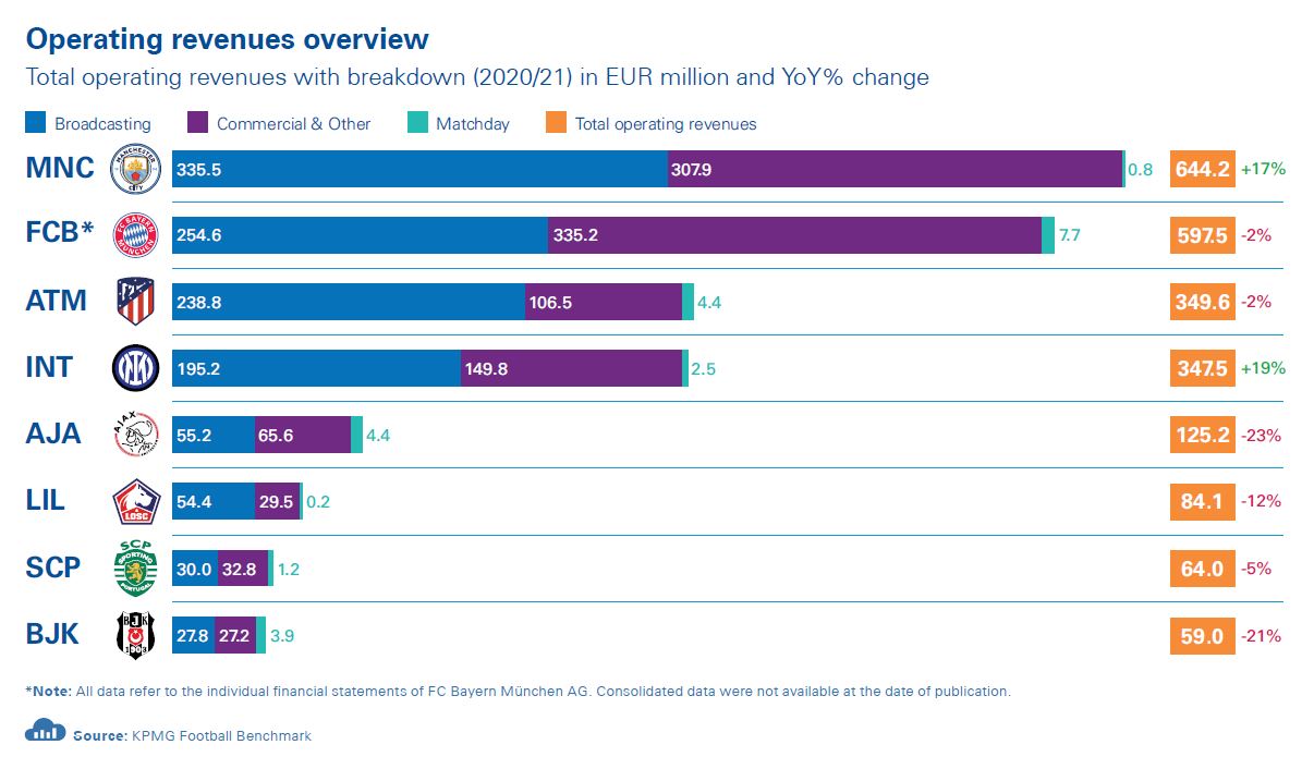 - Manchester City FC have been the only champions who could register not only annual growth in total operating revenues, but surpass their total income of the last pre-COVID season of 2018/19 as well. Their total income of EUR 644m is not only the highest among the champions, but also in Europe, according to data available for top clubs as of today - the club have been able to leapfrog city rivals Manchester United FC (who saw EUR 557m) for the first time.