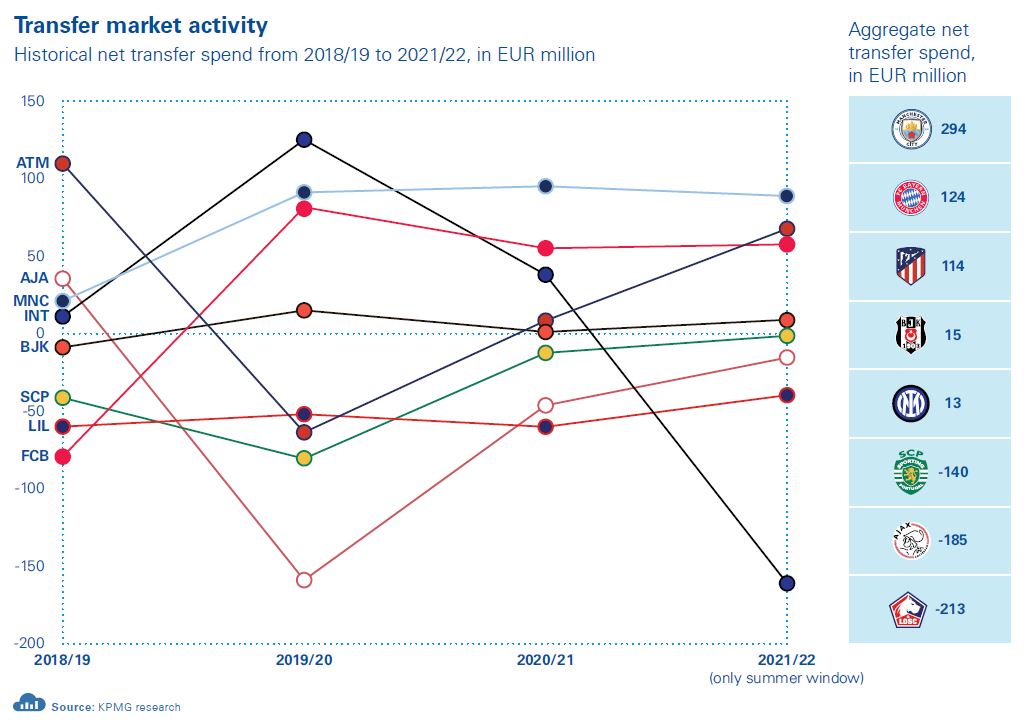 An overview of the net transfer spending of these clubs over the past four seasons showcases that clubs in smaller leagues act as “net sellers” – they either nurture or buy young players at affordable prices before selling them at a premium fee to the “net buyers”, who sit on the other end of the equation. Indeed, Manchester City FC showed the highest aggregate net transfer spend (EUR 294m) in that period, while Atlético de Madrid and FC Bayern München have both recorded an aggregate four-season net transfer spend of over EUR 100m. FC Internazionale showed the most evident decrease in net transfer spending in the last two football seasons. Meanwhile, the three clubs for whom player trading income is a core aspect of their business model registered the lowest aggregate net transfer spend: indeed, Sporting CP, AFC Ajax and LOSC Lille generated income for outgoing players higher than expenditure for incoming players in every single season considered, except for AFC Ajax in 2018/19.