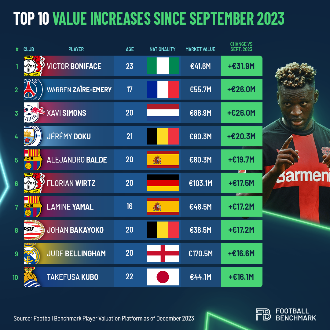 During this stellar run, two stars have shone brightly: Victor Boniface and Florian Wirtz. The 23-year-old Nigerian striker, blazes a trail with 16 goals and 8 assists across 23 appearances in all competitions, propelling his market value by nearly €32 million since September. Leverkusen's number 10, German attacking midfielder Florian Wirtz, has contributed with 8 goals and 12 assists in 23 appearances, elevating his market value by €17.53 million. The Leverkusen roster boasts additional noteworthy surges in market value, including Jeremie Frimpong (+€13.41 million), Exequiel Palacios (+€12.72 million), and Amine Adli (+€10.68 million).