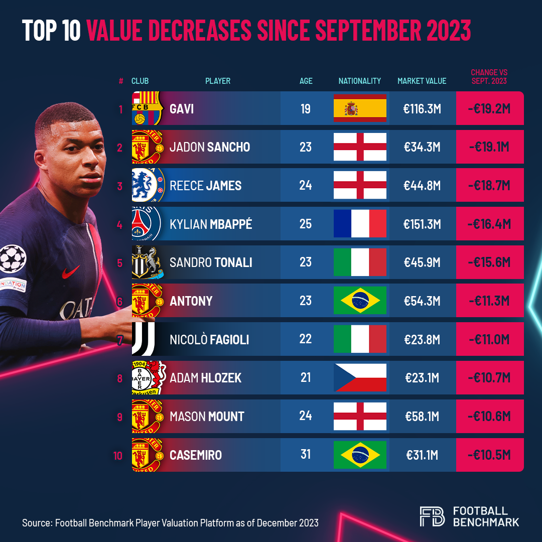 Two players on the list have been banned from playing football in the coming months. Sandro Tonali, Newcastle United's second most expensive signing to date, received a 10-month ban for breaching Italian betting regulations. The Italian midfielder played his last game in October against Borussia Dortmund in the Champions League, and his market value has decreased by €15.56 million since last September. Nicolò Fagioli of Juventus FC also received a seven-month ban for breaching rules on betting on matches. The midfielder had only made six appearances for Juve this season, and his market value decreased by €11 million.