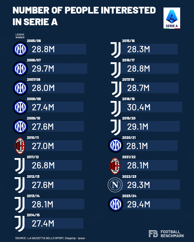Despite this, Serie A remain one of the few irreplaceable rituals of Italian society. This is confirmed by the Sponsor Value research conducted by StageUp and Ipsos. Interest in Serie A, which saw significant growth between 2010 and 2019, has stabilized just below the 30 million mark: the June survey recorded a total of 29.45 million people interested in the league, showing a slight increase from the previous year but not reaching the peak of 30.4 million recorded in 2018/19.