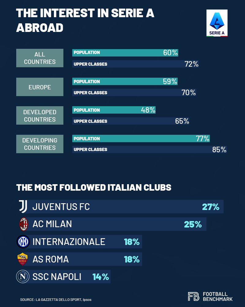 Ipsos analysts note: “The survey highlights that football is a vital aspect of Italian culture and that the international dimension, especially within the BRICS nations, represents a considerable opportunity for expanding the Serie A brand. This brand is associated with values of excellence, style, and prestige, closely linked to 'Made in Italy,' further driven by the league's competitiveness.” Juventus FC and AC Milan are the most admired Italian teams abroad, with 27% and 25% interest respectively, followed by AS Roma (18%), FC Internazionale Milano (18%) and SSC Napoli (14%).