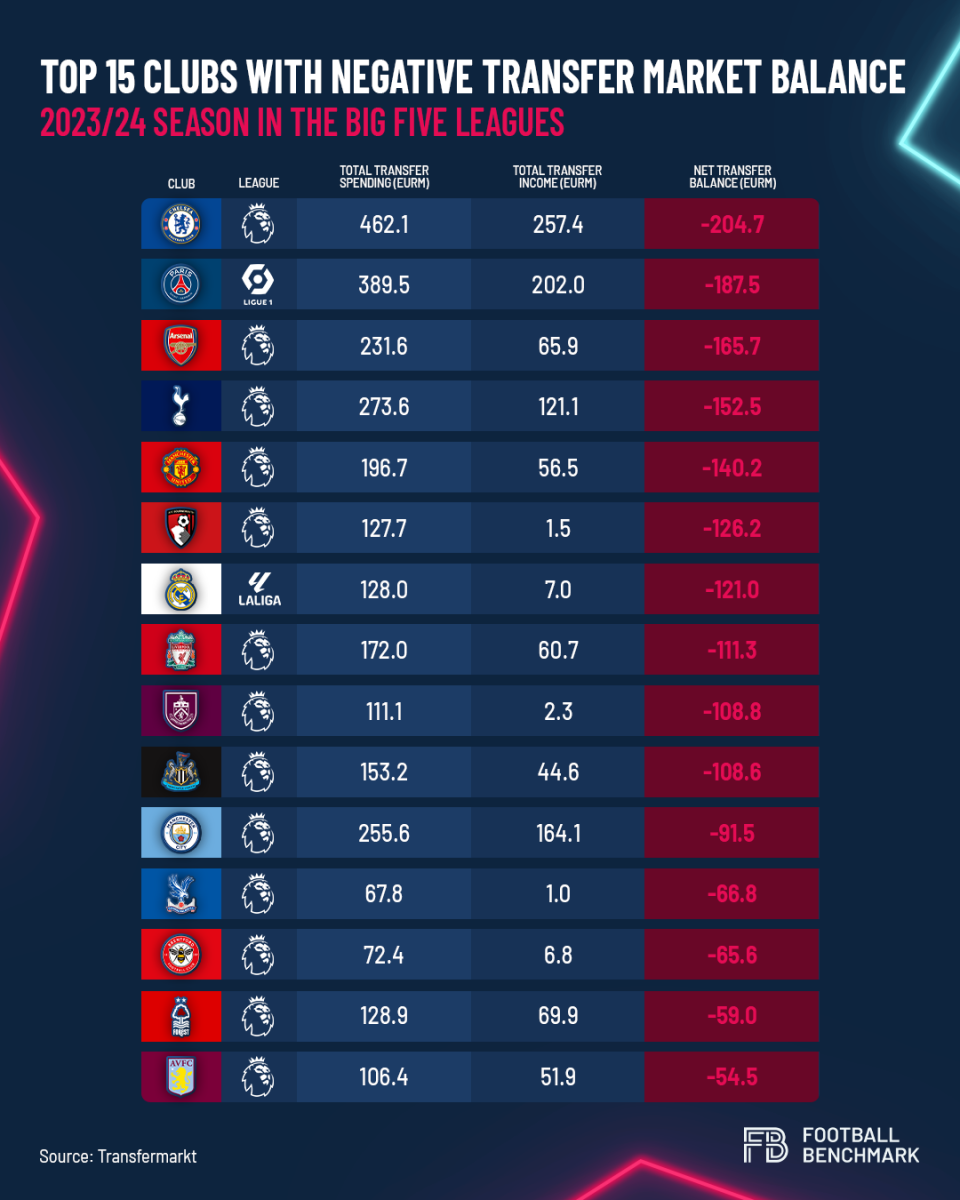 This list is dominated by Premier League clubs, with Paris Saint-Germain and Real Madrid being the only exceptions.