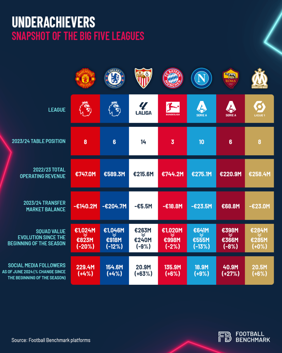 Manchester United FC, Chelsea FC, Sevilla FC, FC Bayern München, SSC Napoli, AS Roma and Olympique de Marseille are among the underachievers of the 2023/24 season in the Big Five leagues.