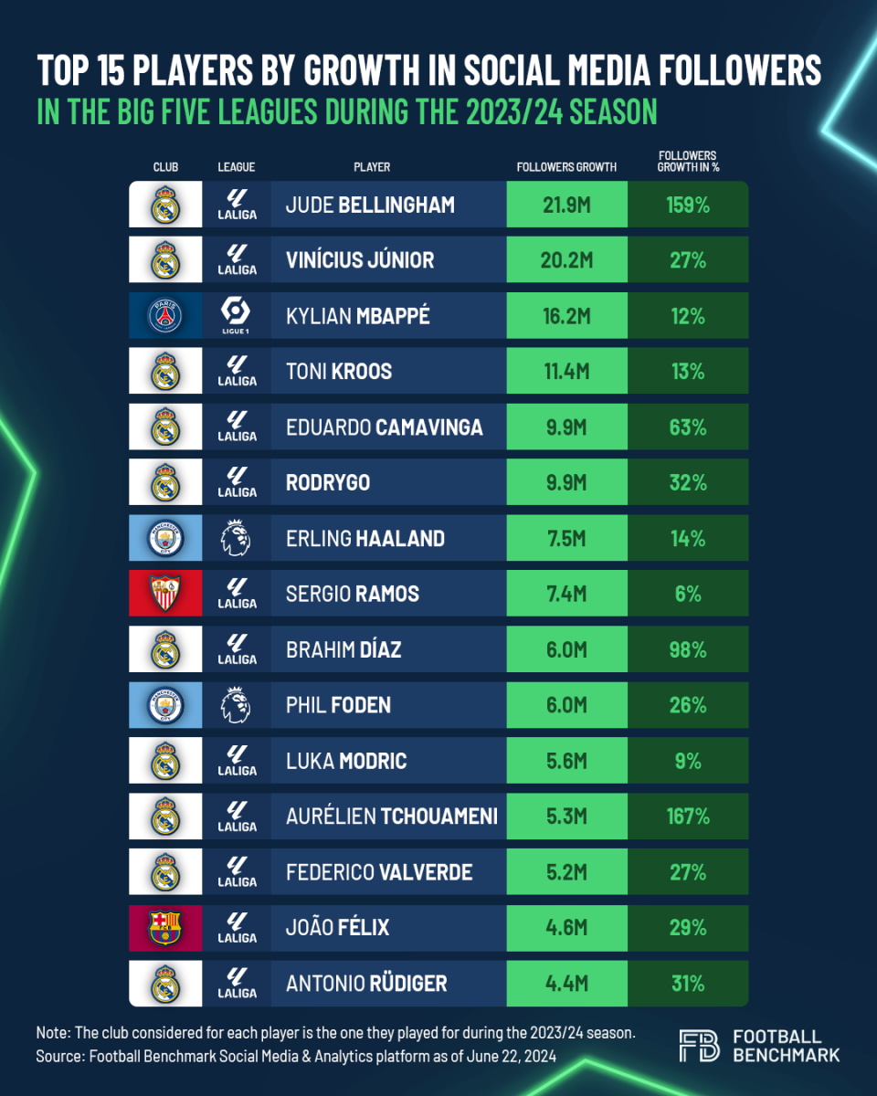 Real Madrid are setting the pace in the social media landscape also at the players’ level. 2023 Golden Boy winner Jude Bellingham and Vinicius Junior each amassed over 20 million new followers, placing them among the top players in terms of follower growth since the season's inception.