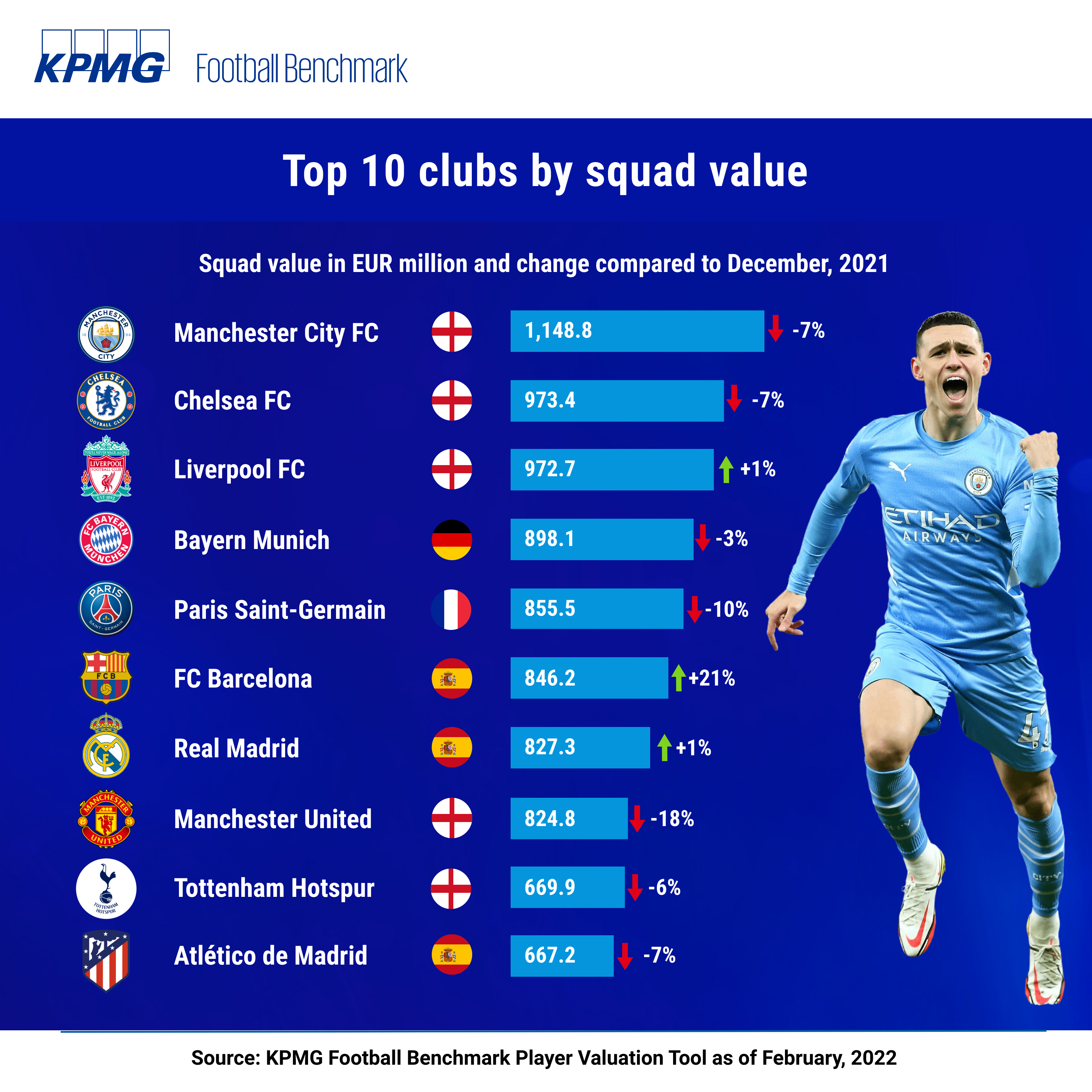 Looking at the top 10 clubs by squad value, we find the same clubs as three months ago, with Manchester City and Chelsea retaining their top spot. However, the rest of the ranking reveals some notable changes. Manchester United dropped five positions (from 3rd to 8th) with a squad value decreasing from EUR 1,011m to EUR 824.8m since December, mainly as some high-value players left on loan. In contrast, Barcelona jumped from 10th place to 6th, also leapfrogging Real Madrid, among others. The Catalans gained EUR 146m in squad value, with January signings Adama Traoré, Ferrán Torres, and Pierre-Emerick Aubameyang and with their youngsters such as Gavi (EUR 50.1m), Nico González (EUR 35.7m) and Ez Abde (EUR 16.2m) added to our database for the first time. It is also worth noting, that Manchester City are now the only club to have a squad exceeding the EUR 1b threshold in value, whereas in last December, that elite also included Chelsea and Manchester United.