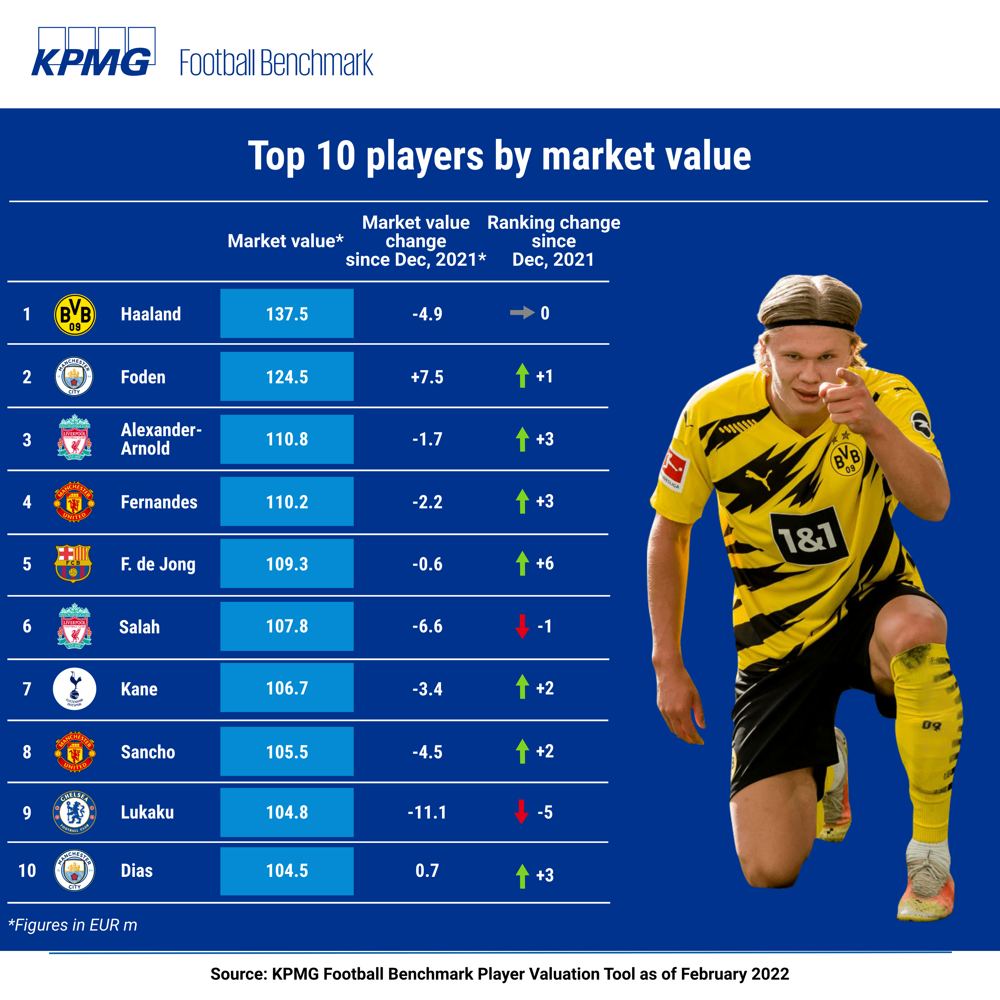The ranking of the top 10 players by market value includes eight players at Premier League clubs, with the only exceptions being Borussia Dortmund striker Erling Haaland, who has retained his top position and Barcelona midfielder Frenkie de Jong, who jumped six positions since December (from 11th to 5th place). The current ranking sees Manchester City defender Rúben Dias joins the top 10 for the first time. Value changes in the past three months resulted in Trent Alexander-Arnold and Rúben Dias jumping 3 positions, and both Harry Kane and Jadon Sancho rising two spots, whereas Romelu Lukaku dropped from 4th to 9th in the ranking with a loss of EUR 11m in value since December, the highest decrease in the top ten. In contrast, Phil Foden keeps growing his worth: after gaining EUR 67m in value in one year (since December 2020 to December 2021), now he could add further EUR 7.7m in the past three months.