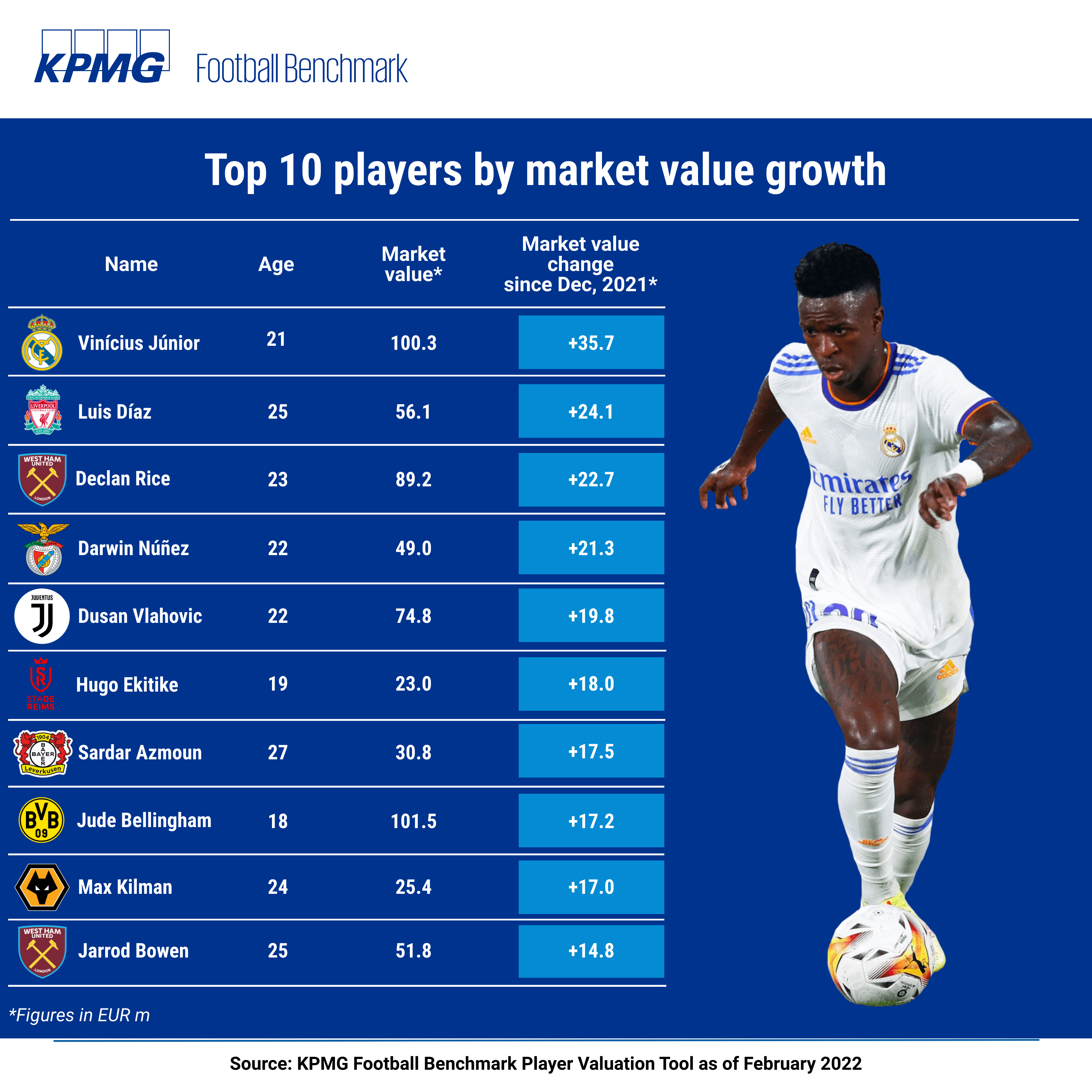 Vinícius Junior leads the ranking of players who registered the largest growth in market value (+35.7m) since our latest update in December 2021. Real Madrid’s 21-year-old Brazilian records 16 goals and 10 assists in all tournaments this season, a performance also reflected in his market value that surpassed EUR 100m for the first time, also making him the 12th most valuable footballer. Vinícius is followed by Colombian Luis Díaz, whose market value growth (+ EUR 24.1m) is mainly due to his recent transfer to Liverpool. West Ham are represented by two players in this ranking with Declan Rice in 3rd place (+ EUR 22.7m) and Jarrod Bowen at 10th (+ EUR 14.8m). The market value of winter transfer window’s number one signing, Juventus’ Dusan Vlahovic’s is currently estimated at EUR 74.8m, after a growth of 19.8m. Stade Reims forward Hugo Ekitike has lately been linked to Liverpool, Chelsea, Newcastle and Borussia Dortmund: the 19-year-old Frenchman has registered 9 goals and 3 assists this season, helping his market value increasing by EUR 18m since December.