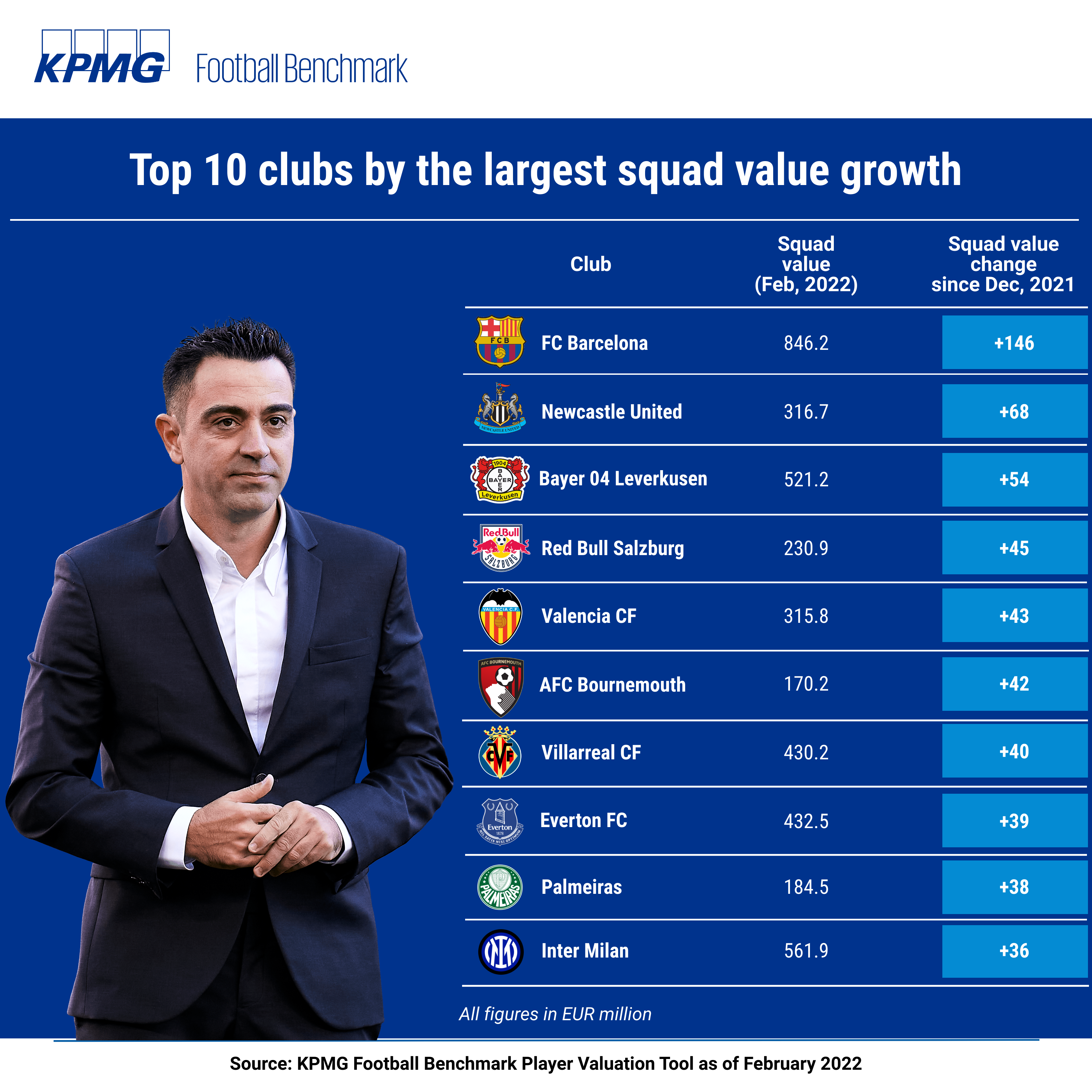 Considering the clubs with the largest squad value growth since December, we find Barcelona with the highest growth, as analyzed above. Unsurprisingly, they are followed by Newcastle United, the team that spent the most during the latest transfer window. By adding players such as Kieran Trippier, Bruno Guimarães or Matt Target, the club’s squad value has increased by EUR 68m. Austria’s Red Bull Salzburg are in 4th place, mainly because of their young talents, such as Karim Adeyemi, Nicolas Seiwald or Mohamed Camara growing fast in value. Similarly, in the squad of Libertadores Cup winner Palmeiras, the market value growth of 19-year-old Renan, 20-year-old Danilo and 26-year-old Rony makes the difference.