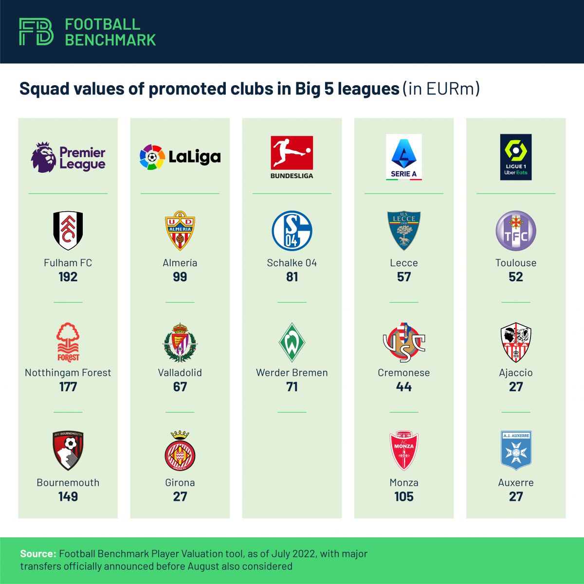 This analysis provides an overview of all the promoted clubs within the top five leagues. The estimated squad values for these clubs refer to July 2022, based on our proprietary algorithms  (see our methodology here), with major transfers of the current, ongoing transfer window that were officially announced before August also taken into account.
