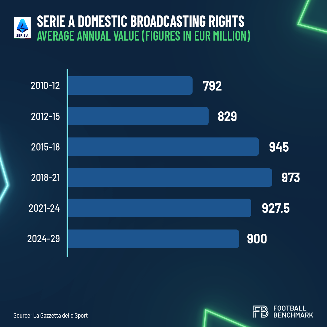 At current exchange rates, this translates to €7.8 billion, nearly reaching €2 billion annually and more than doubling Serie A's revenue. For an almost overlapping period, Serie A had sold domestic live rights to DAZN and Sky for €900 million per season (around €15 million for yet-unplaced highlights). The second perspective contextualizes the data, inviting a deeper reflection on the scenario—the flip side of the coin.