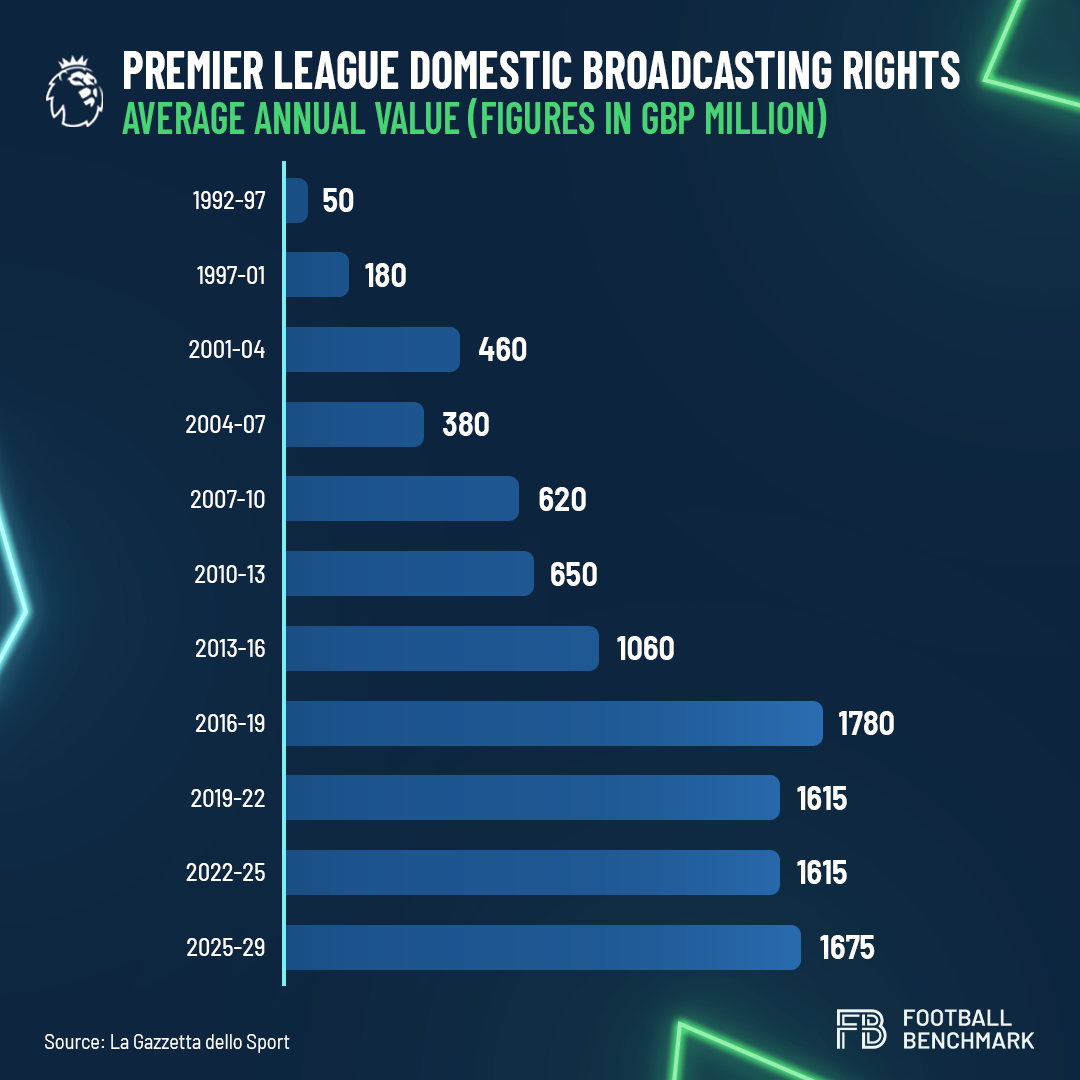 While the Premier League maintains remarkably high levels for its national TV rights and a substantial competitive advantage over other leagues impacting transfer campaigns, the recent selling cycle echoed a trend seen in recent commercialization: the once-rapid growth of the Premier League's TV rights has now stalled, at least within the UK. A look at the historical trend solidifies this observation.